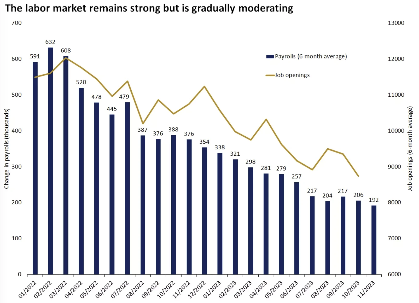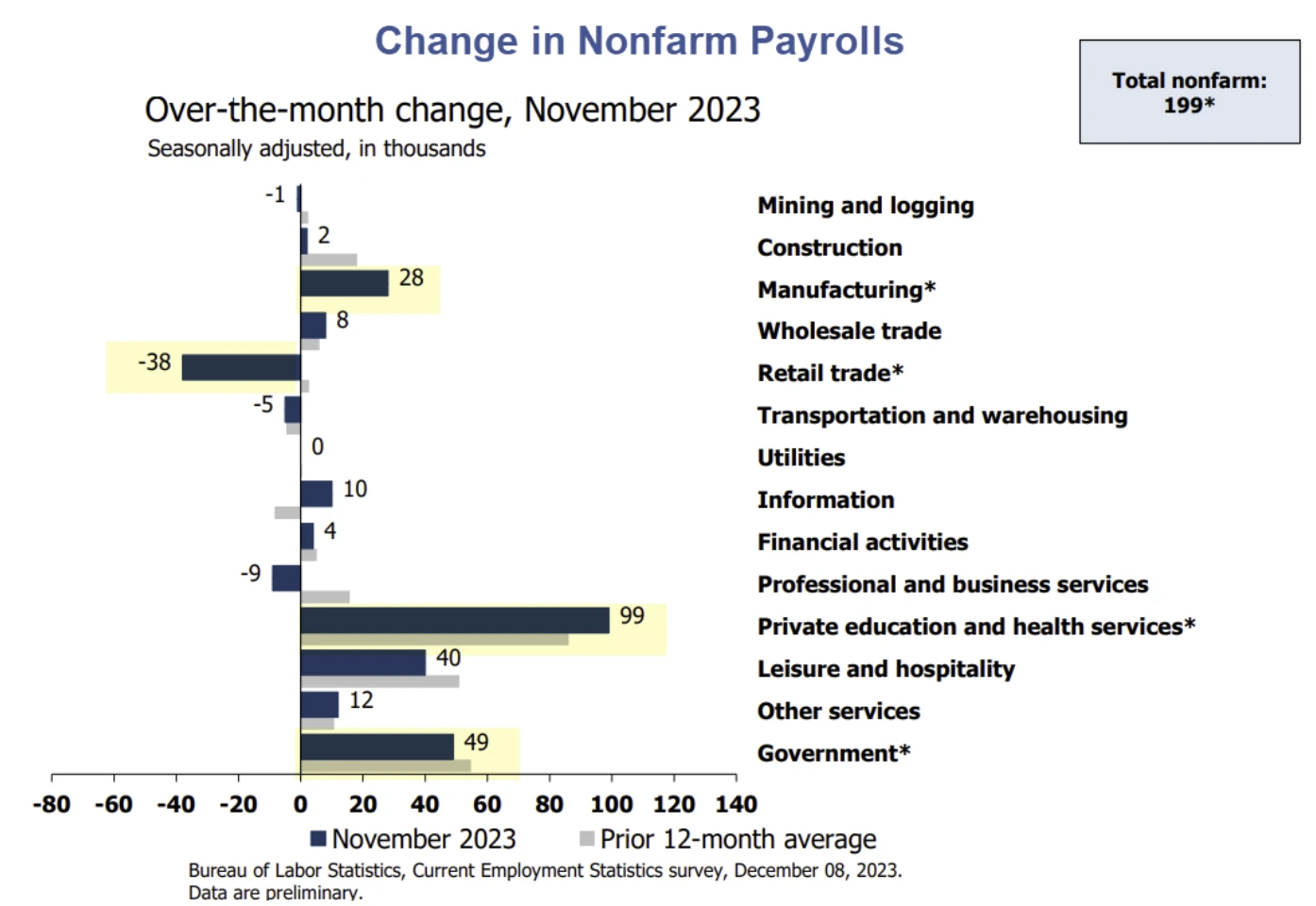 11 月份美国经济新增就业岗位 19.9 万个,略高于预期,失业率降至 3.7% (四个月低点),劳动力参与率上升,所有这些都表明劳动力市场健康。然而,罢工的汽车工人和影视从业者的回归使工资增加了 4.7 万人。所以拉到 3 个月和 6 个月平均值来看实际增长水平基本稳定。