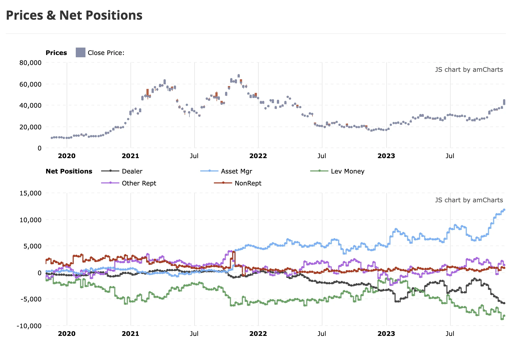 BTC 期货大型投机者净空头略有减少,但仍维持在历史高位,做市商净空头上周刷新历史最高水平,两者与资管类历史最高净多头水平形成对比: