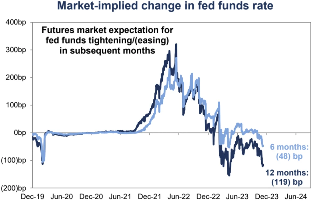 利率市场目前预测明年 3 月降息概率达到 71% , 5 月降息概率 100% ,全年 120 bp 也就是 5 次,有点极端,对比今年 3 月银行业危机时候市场恐慌创下的 150 bp 的预期: