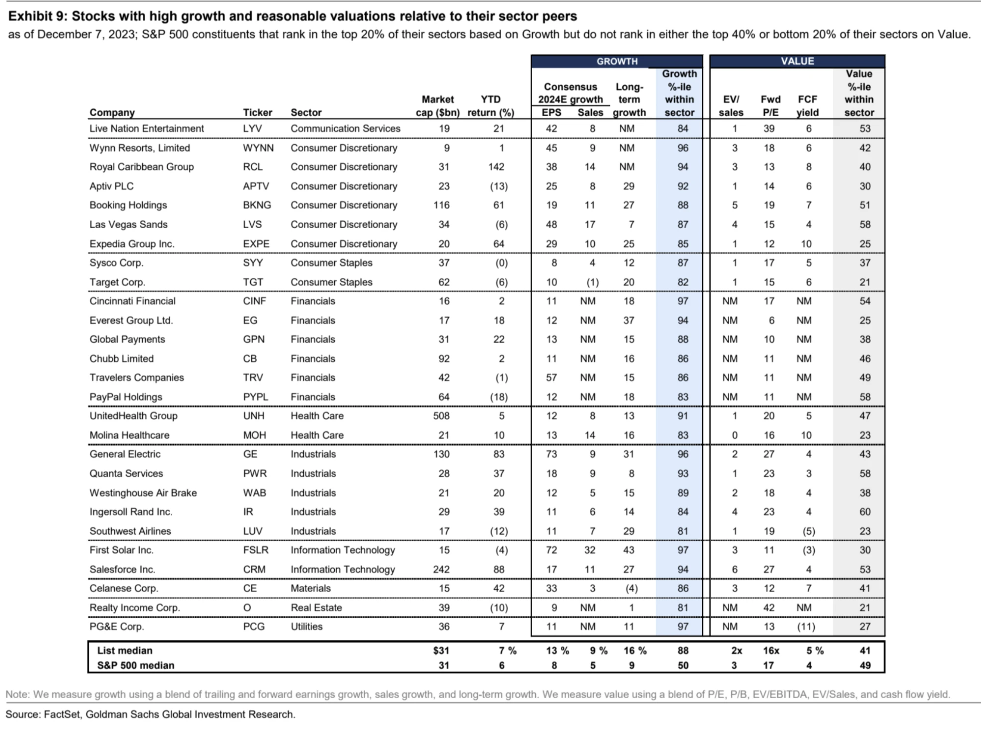 下图是 GS 筛选的相对于行业同行具有高增长和合理估值的股票。这些股票在增长方面排名在其行业的前 20% ,但估值既没有排名在其行业的前 40% 也没有排名后 20% :