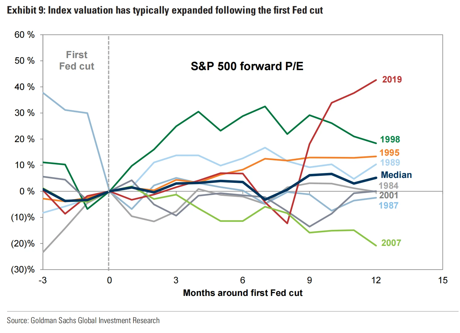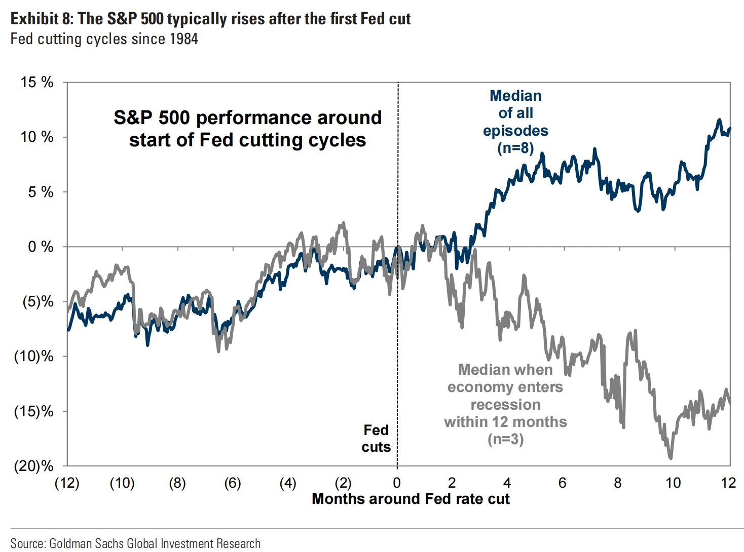 所以经济衰退仍是关键问题:当经济衰退在第一次美联储降息后不久发生时,股票历史上表现不佳,这种情况在 8 个周期中有 3 次: