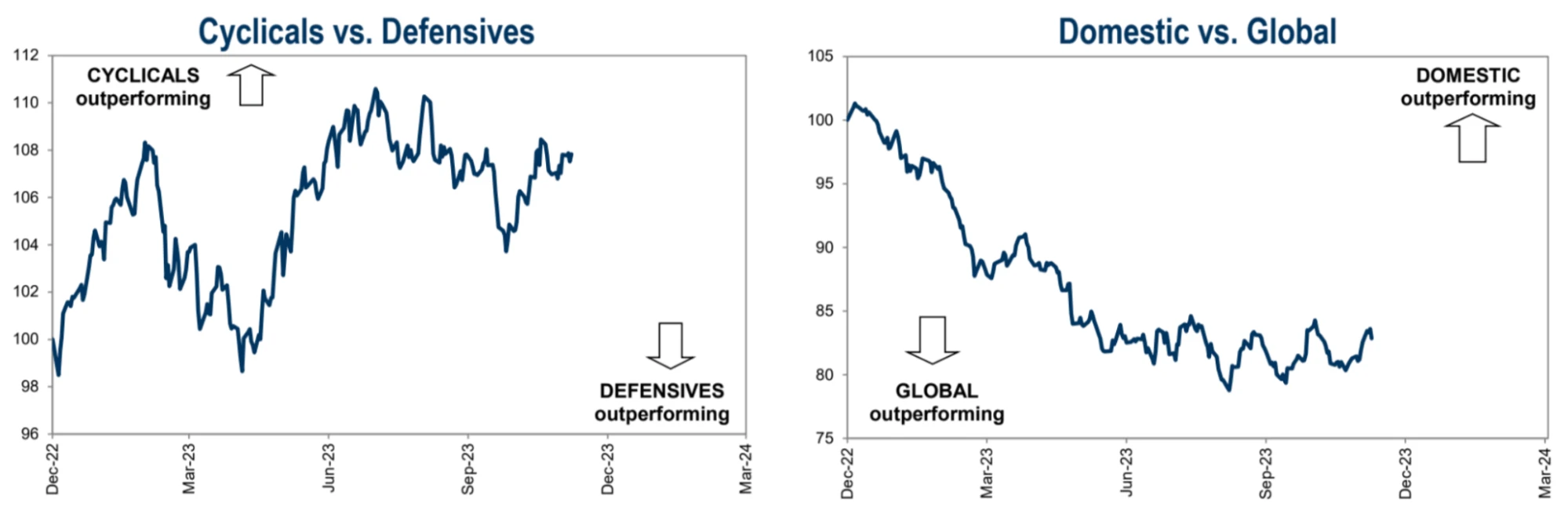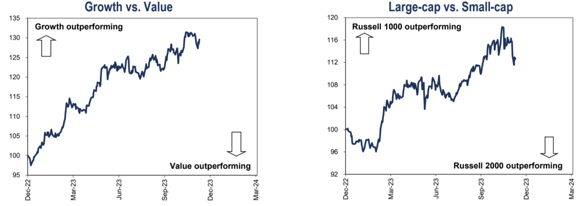 但由于进入 2024 年初的经济疲软,以及过度定价的利率市场,风险偏好有可能先降再升。债券以及其替代品,比如传统防御性行业,在 2024 年初经济进入疲软时先出现机会,然后随着增长重新抬头,小盘股以及成长股的投资机会可能晚些再次出现。
