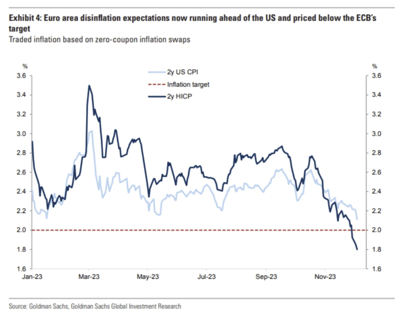 极端的预期不是没有根据。目前通胀低于预期的程度与 2024 年早些时候广泛预期差距很大,特别是欧洲的趋势显示出在欧洲通胀可能出现戏剧性的低于预期的风险,下图是基于零息通胀互换( Zero -Coupon Inflation Swap)衍生品定价的欧美 2 年期通胀预期,美国接近 2% ,而欧元区通胀预期已经低于欧洲央行 2% 的通胀目标只有 1.8% :
