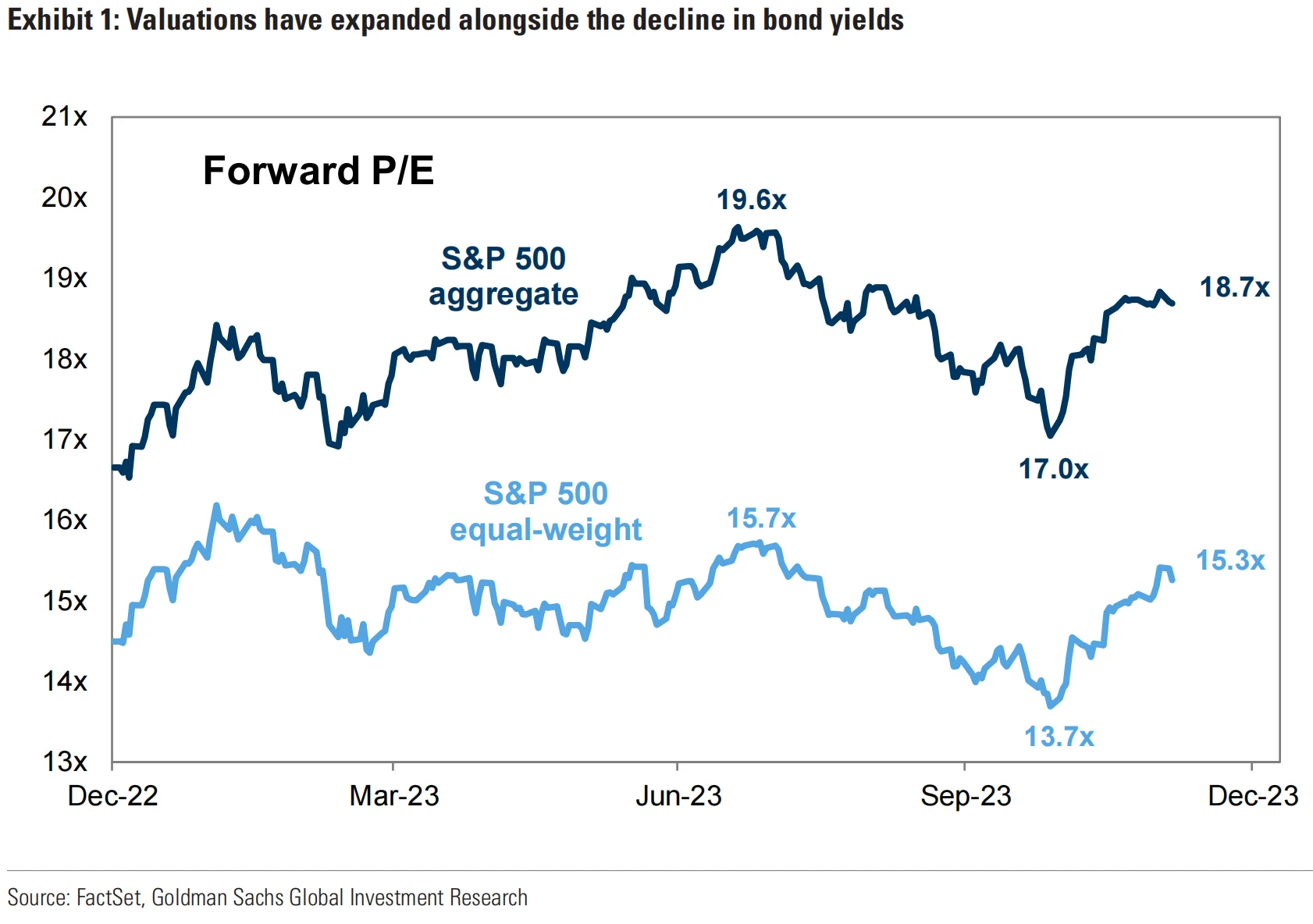 标准普尔 500 指数的整体市盈率仅比高盛的乐观情景低 5% 。高盛的乐观情景基于实际收益率降至 1.5% ,市盈率达到 20 倍。而当前实际收益率 2% 左右,市盈率接近 19 倍。GS 认为未来可能有三种情况: