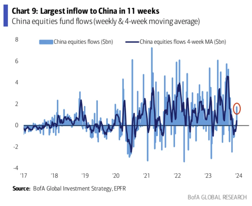 值得注意的是尽管中国股票大跌,但公开市场基金出现了 11 周来最大的单周流入: