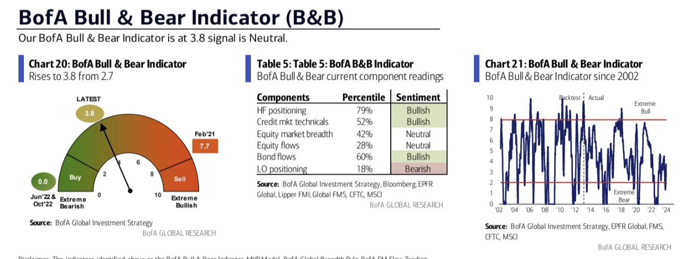 BofA 市场情绪指标(Bull & Bear Indicator)大幅上升至 3.8,显示投资者悲观情绪正在明显改善。不过该指标接近中性区,意味着市场情绪转向不再对风险资产有利。