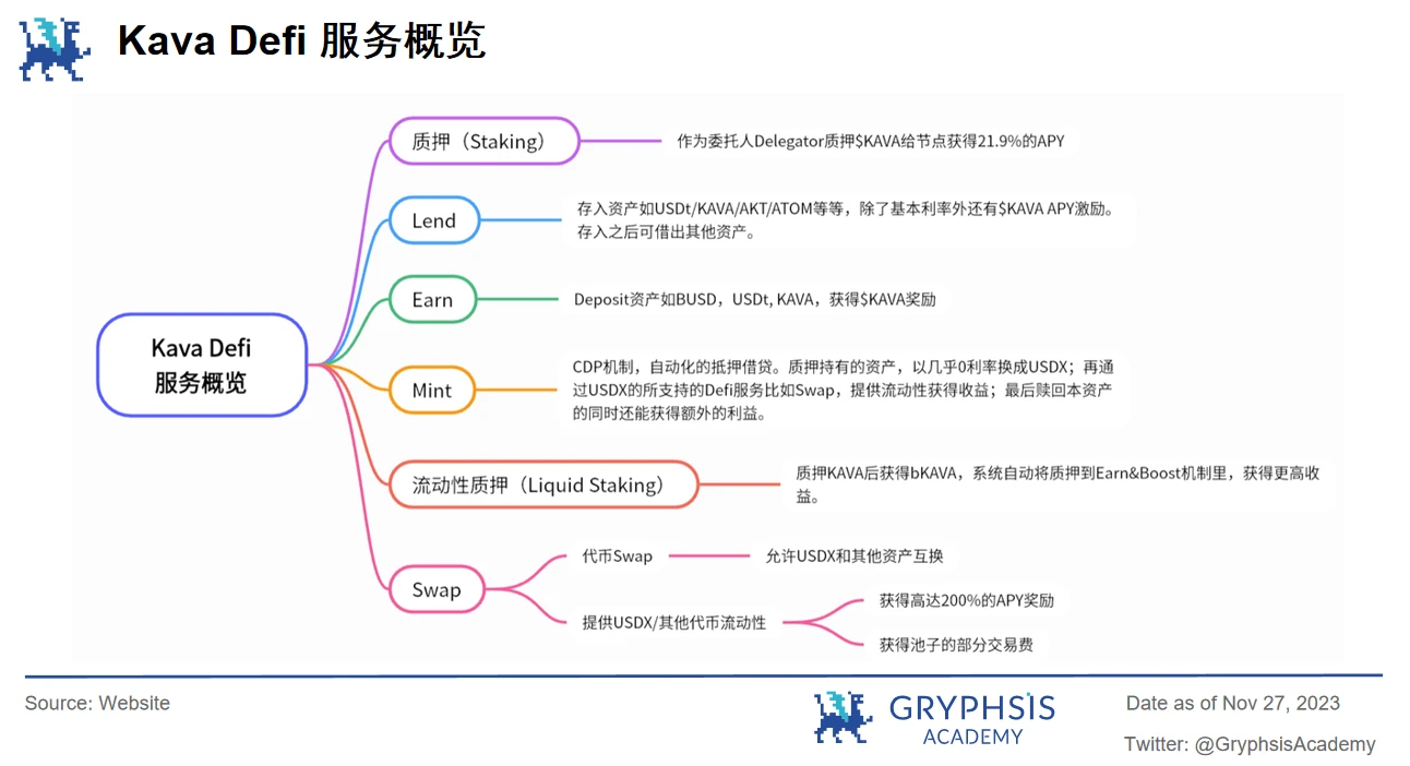 Kava Mint:由 Kava CDP 协议更名得来,允许用户抵押跨链资产来铸造抵押稳定币 USDX 。