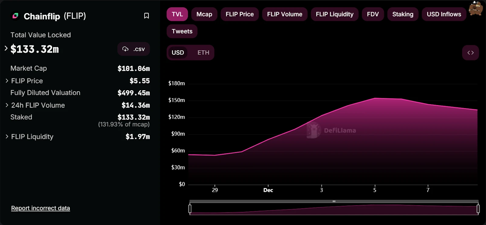 从生态数据来看:目前 THORchain TVL 有 1.051 Billion ,而当前 Chainflip 只有 133.32 M,相差 10 倍;24 小时代币的成交量$RUNE 将近为$FLIP 的 40 倍,代币的流通性更高;但从代币的质押量来看,目前生态有超过 MC 131.93% 的$FLIP 被质押,$RUNE 质押量只有 MC 的 34.9% 。