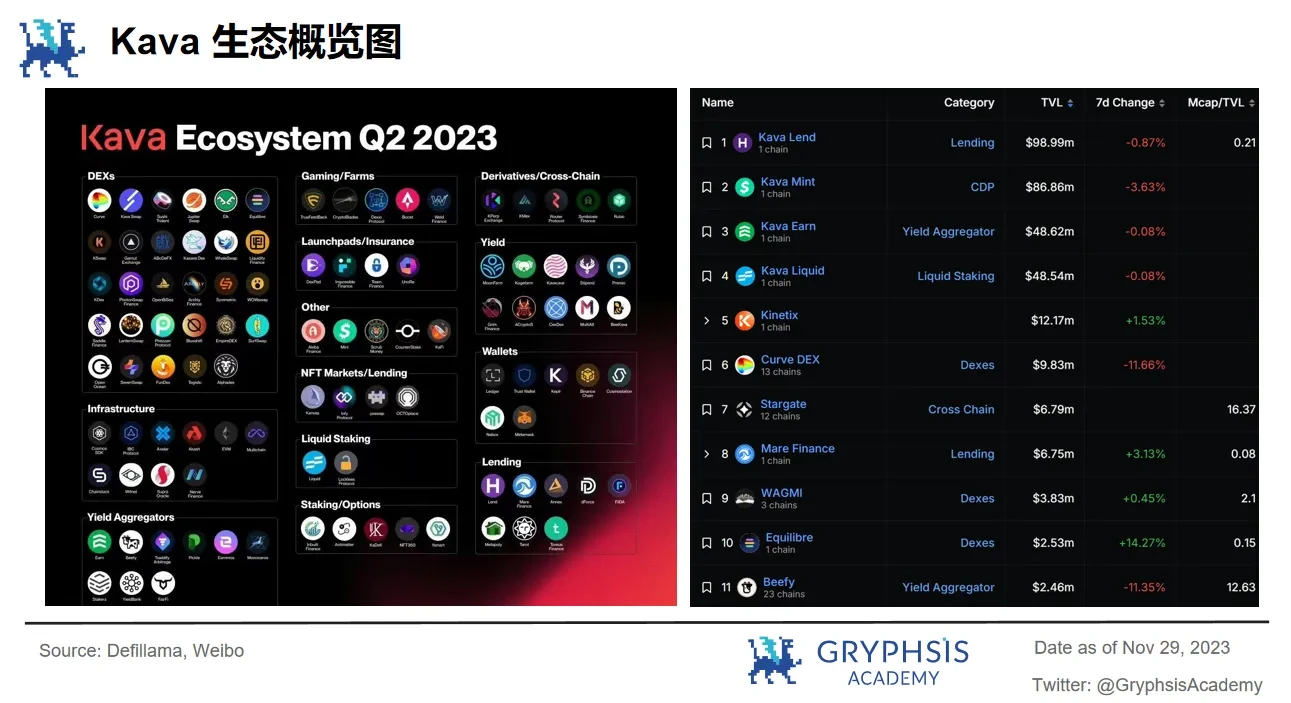 目前 Kava 总 TVL 为 340.67 M,稳定币市值 129.06 M,日交易量为 1.44 M。已经有超过 116 个协议部署在其之上,其中 DeFi 类目占比偏高。但根据协议排名来看,当前仍以 Kava 本土的 Defi 服务占据主导地位,前五基本被 Kava Lend, Kava Mint, Kava Earn 等等涵盖,生态中并没有像 Arbitrum 上的 Blur 那样有较为出彩的原生独立协议。