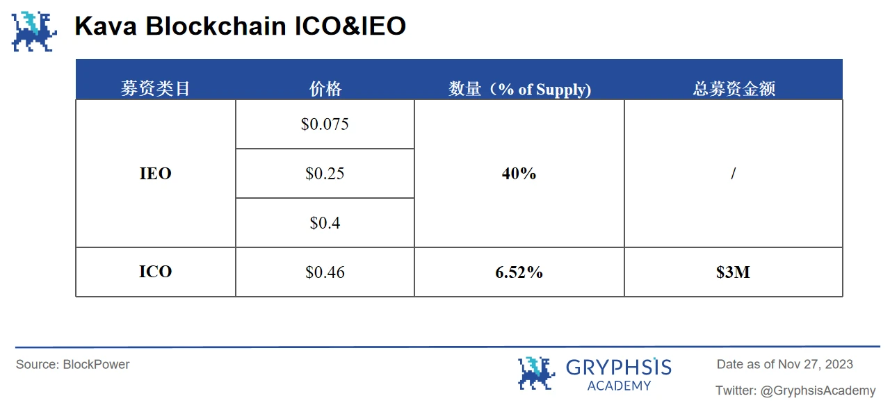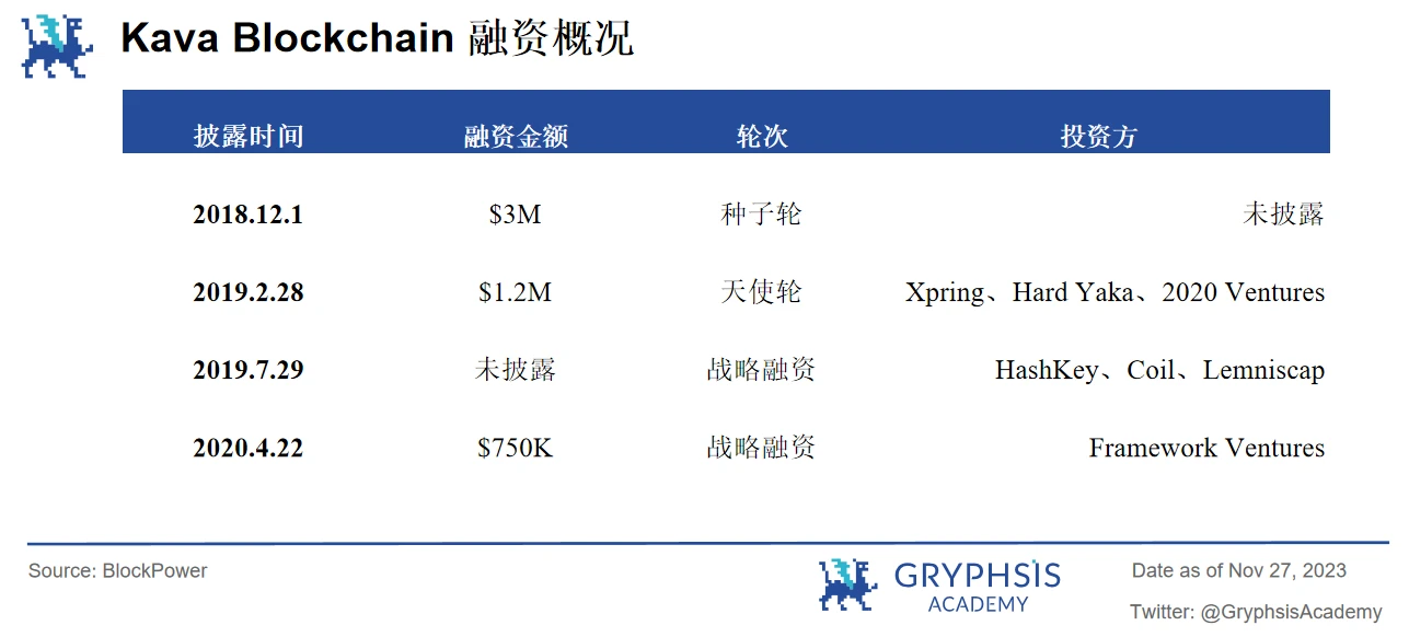 Kava 已披露的融资将近 $ 5 M,投资方包括 Binance Labs、HashKey 等等。于 2019 年 10 月 16 日发行 $KAVA,通过多轮私募将 40% 的初始供应量出售给投资者,另外总供应量的 6.25% 在 Binance Launchpad 上以$ 0.46 价格公开出售,累积筹得$ 3 M。