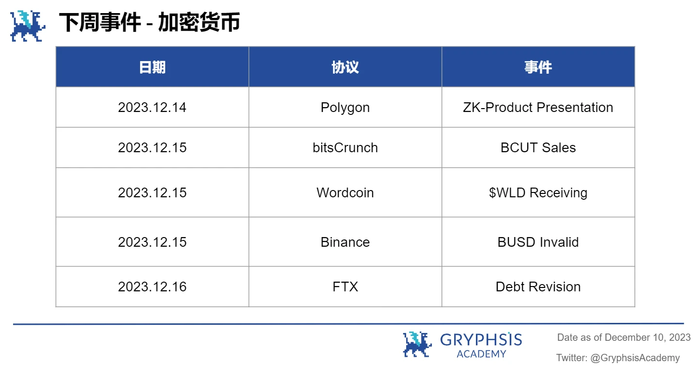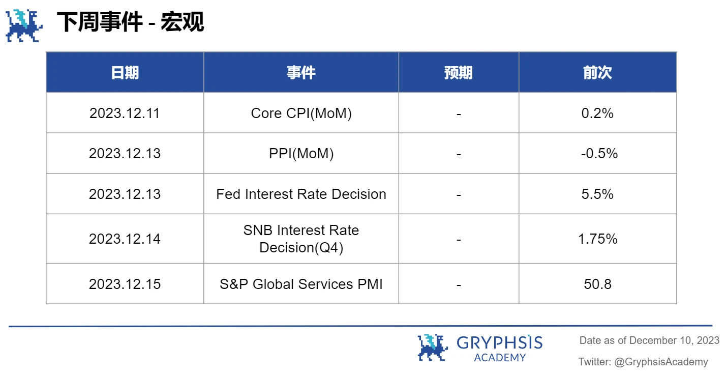 本周,股市层面呈细微增长,SPX 和 NASDAQ 分别增长 0.21% 和 0.69% ,相比于加密行业的明显上涨幅度不大。在未来一周,要关注核心 CPI、PPI、美联储利率决议和瑞士央行利率决议等重大事件。