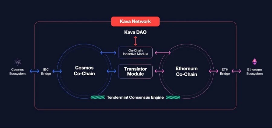 共识引擎上。 Ethereum Co-Chain 允许开发者使用 Solidity 部署或者直接迁移应用到 Kava 上,Cosmos Co-Chain 通过 IBC 协议和整个 Cosmos 生态进行互通,两者通过 Translator Module 来连接两个不同的执行环境。