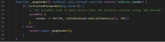 。当[Forwarder]调用合约时,_msgSender() 会检查 calldata 数据,并将其右移,截断最后的 20 个字节作为预期的 msg.sender。
