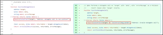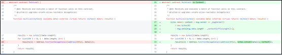 2.禁止任何合约调用 multicall 来防止[Forwarder]使用它,以 ThirdWeb 为例,该方法与 OpenZeppelin 的解决方案相比,OpenZeppelin 仍然允许通过合约进行 multicall。以下是 ThirdWeb 的相关 bug 版本和已更新版本的对比图。