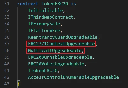 首先,此次攻击事件主要涉及几个方面:ERC 2771、Multicall、经过精心构造的 calldata。我们可以从 TIME 代币合约中找到相关的继承: