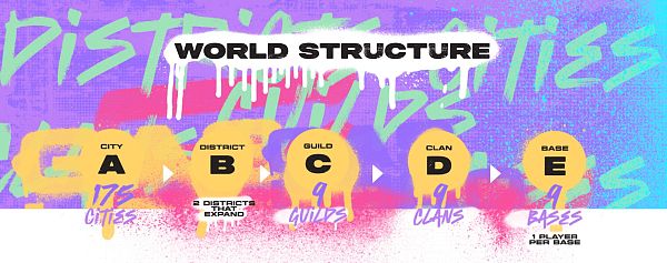 《Gas Hero》的游戏地图分成五个层级,包括 City (城市) - District (辖区) - 9 个 Guild (公会) - 9 个 Clan (聚落) - 9 个 Base (基地)。游戏中设有 175 个城市,分布在经历了灭绝战争的地球上,每个城市都是玩家重建文明的新起点。