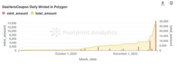 据 11 月 1 日 Find Satoshi Lab(FSL)的公告,《Gas Hero》计划于 11 月 24 日至 12 月 8 日进行社区测试,特定用户群如 Gas Hero 徽章持有者、 Find Satoshi Lab 大使和合作伙伴等,将获得测试资格。作为一款大型多人在线游戏(MMO),《Gas Hero》在丰富的科幻世界中展开其叙事,提供深度沉浸的游戏体验,并将其故事背景扩展到漫画书领域,与 STEPN 的运动驱动奖励机制形成鲜明对比。《Gas Hero》更加注重提供深度参与和策略性的游戏环境。根据 Footprint Analytics 的数据, 11 月中旬,《Gas Hero》每日 Coupon 的铸造数量超过 30, 000 枚,显示出其受欢迎程度。