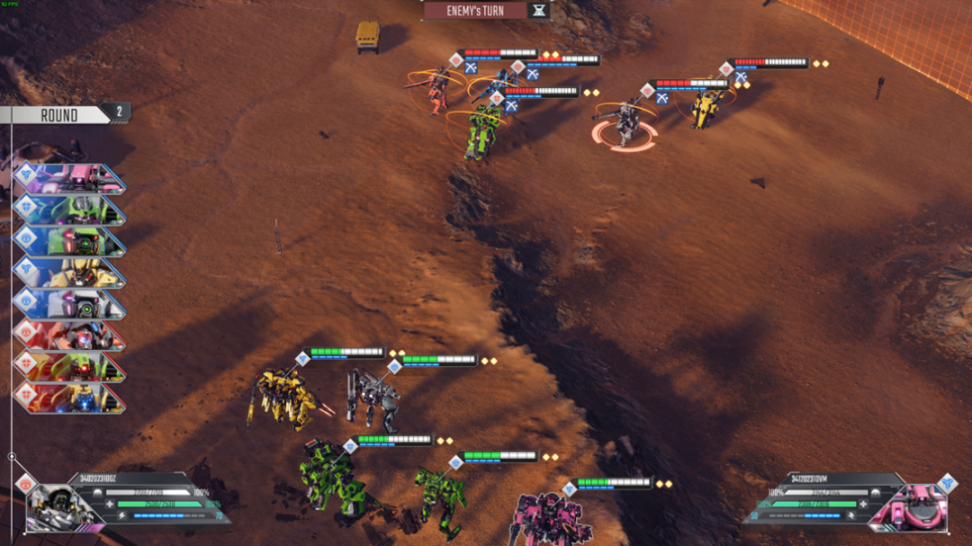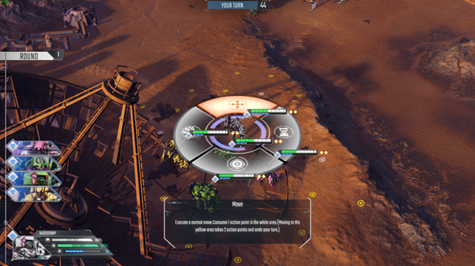 在玩家的回合中,共有三种操作:移动、原地待命、释放技能,每台机甲每回合只有两个行动点数(显示在血条旁),移动和释放技能都会消耗行动点,原地待命则是直接结束这台机甲的行动回合。移动又会根据移动的距离消耗不同的点数,若是近距离移动(显示为白色地点),则还剩一点行动点能进行攻击。
