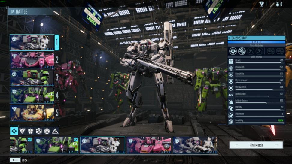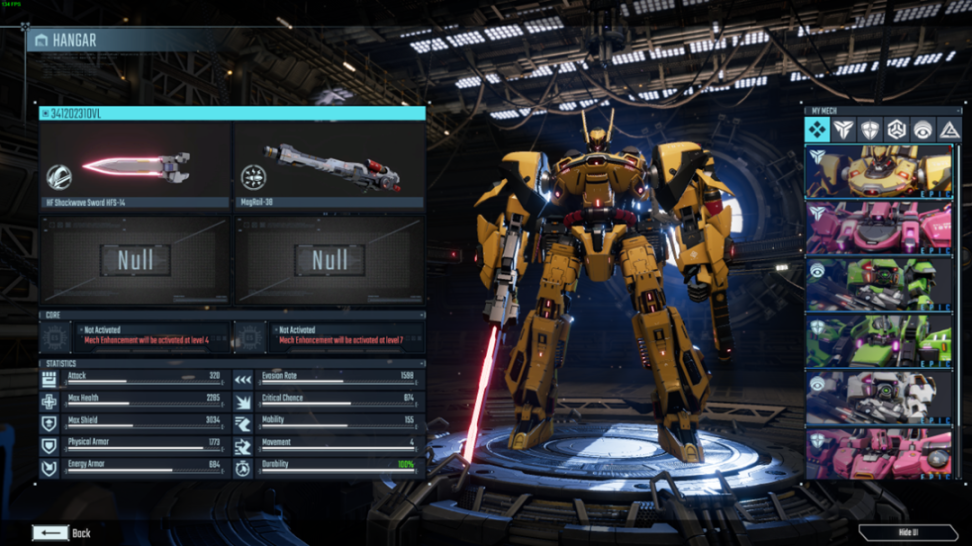 在机库中,玩家可以检视并调整自己拥有的机甲与装备。不同机甲的装备、核心、属性、职业都不同。