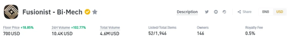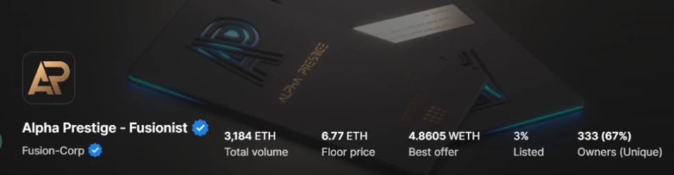 Fusionist 团队在今年早些时候发行的两个 NFT 系列:Bi·Mech 以及 AlphaPrestige,一经推出便一抢而空。Bi·Mech 申购金额超 215 万 BUSD, 4600 人进行申购,超出申购指标 12 倍;Alpha Prestige 发行后 7 日内涨幅达 85% ,时至今日地板价也水涨船高,来到了 6.77 $ETH。