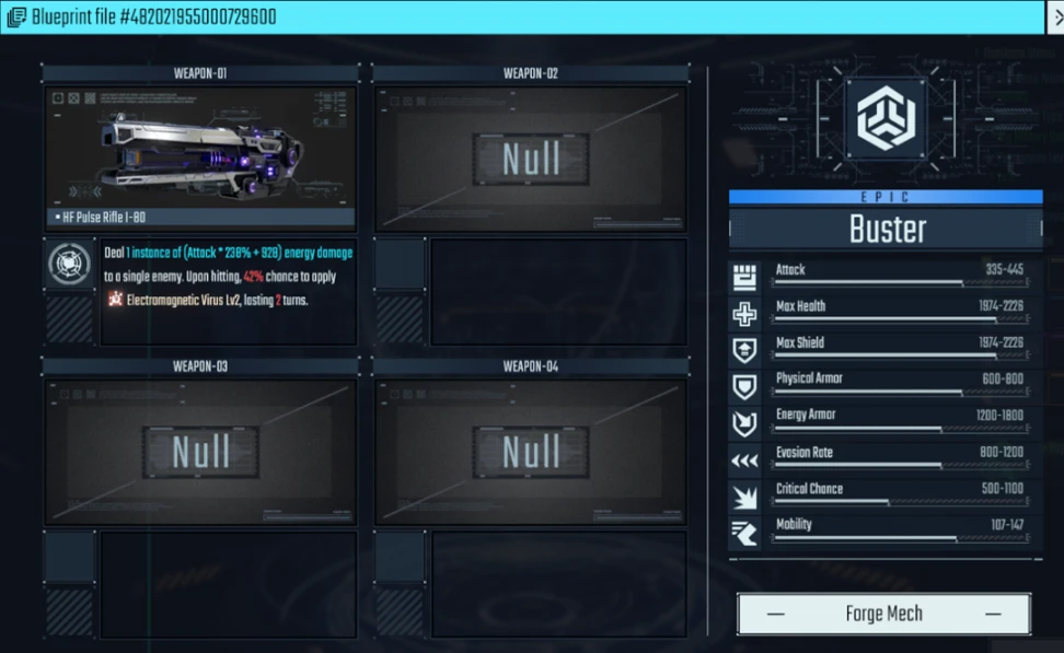 点击蓝图,即可显示该机甲的详细属性以及技能信息。再点击右下角的铸造机甲,即可将新机甲收纳入库。