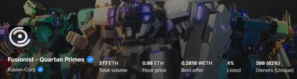 Quartan Primes 是稀有机甲 NFT,可以在未来正式版游戏中使用,目前地板价为 0.98 $ETH。