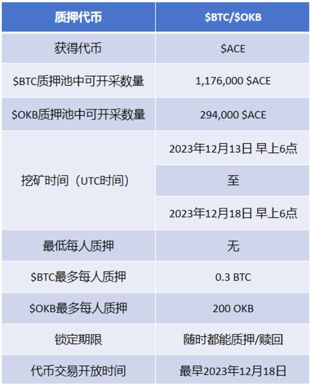 OKXJumpstart 挖矿将于 2023 年 12 月 13 日 14: 00 开始,$BTC 和 $ OKB 持有者都可以通过质押来获得 $ ACE 代币奖励,规则如下: