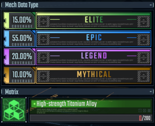 游戏中的机甲分为四个不同的等级:精英(ELITE)、史诗(EPIC)、传奇(LEGEND)以及神秘(MYRHICAL)。四个等级对应四种稀有度,神秘>传奇>史诗>精英,稀有度越高机甲强度就越强。