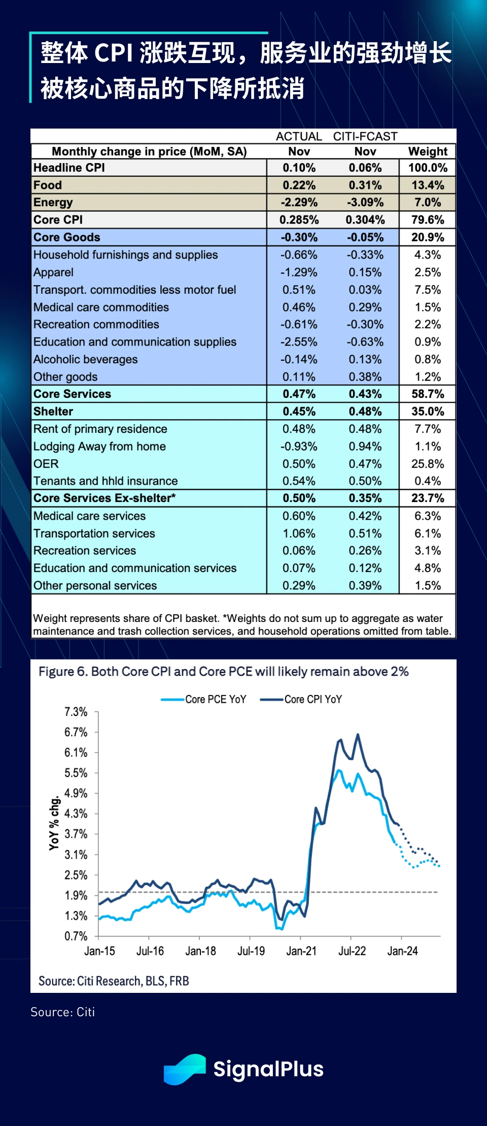 11 月整体 CPI 环比上涨 0.1% ,核心 CPI 上涨 0.3% (均走强),而 CPI 年增速放缓至 3.1% (基数效应),核心 CPI 年增稳定维持在 4.0% ,价格的疲软主要集中在能源(-2.3% )、汽油(-6% ),而服务(+ 0.5% )、房屋(+ 0.4% )和住房成本(+ 0.4% )仍继续推动 CPI 增长,此外,先前美联储偏好的“超级核心” 指数(扣除能源和住房的服务业)仍维持在环比增长 0.44% 的水平,依旧远高于疫情前的标准。