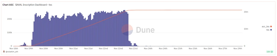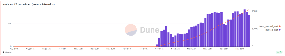 POLS 和 AVAL 的总量都是 2100 万张,POLS 持币地址 80000+,AVAL 持币地址 23000+,铸造进度在 2-3 天左右,可以看出目前大家对于低成本的二层(Layer 2)铭文较有参与兴趣,因为其成本低回报率高,所以 BTC、ETH 链的一些长尾用户均会出现外溢。不光光是这两条链,Heco 链, Fantom 链等均出现 Gas 费飙升的情况,均与铭文有关。