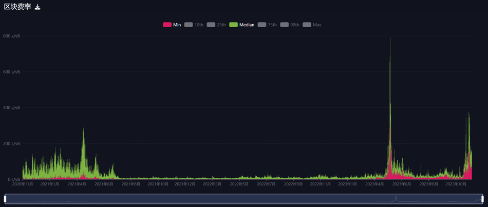 3 年期比特币区块费率图可以直观地看出,在今年 5-6 月和今年 11 月,费率直线飙升,这也体现了用户对于铭文协议的热情,不光是 BRC 20 协议,各种基于比特币网络开发的协议均在此阶段发行,带来了一波「 Bitcoin Summer」。