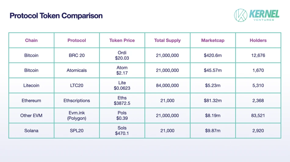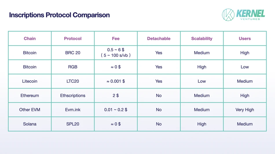 分析 Ordinals 、BRC 20、Atomical、RGB、Pipe 等比特币链上的协议与其他 Pow 链,如 Dogechain 和 Litecoin ,以及以太坊链 Ethscriptions 和 Evm.ink、 Solana 链 SP L2 0 协议,在费率、可拆分性、可扩展性、用户方面进行对比,尤其突出了 RGB 协议的低费率和高扩展性。