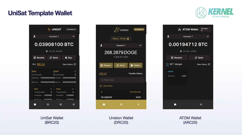 目前 BRC 20 的交易活动主要集中在 OKX 和 UniSat。今年 OKX 主推的 Web3 钱包在 BRC 20 类资产交易上的良好体验,钱包端基础设施的完备,就进一步平滑和缩短了「大妈系投机者」进场的路径,让他们得以顺利进入这个新市场。随着其他各类协议的涌现,不同协议都纷纷出现了不同的交易市场和自己的交易钱包,比如 Atomicals、Dogechain、Litecoin 等等。但是目前市面上的钱包均是 UniSat 的改版,在 UniSat 的开源基础上进行修改。我们把比特币(POW)与以太坊进行对比,可以把各种协议比作各种链,其本质的差别只是在于 Chain ID,所以说未来的产品可能是 UniSat 接入不同协议,需要时可以在不同协议之间切换,直接在钱包中操作即可,类似于小狐狸钱包的切换链。