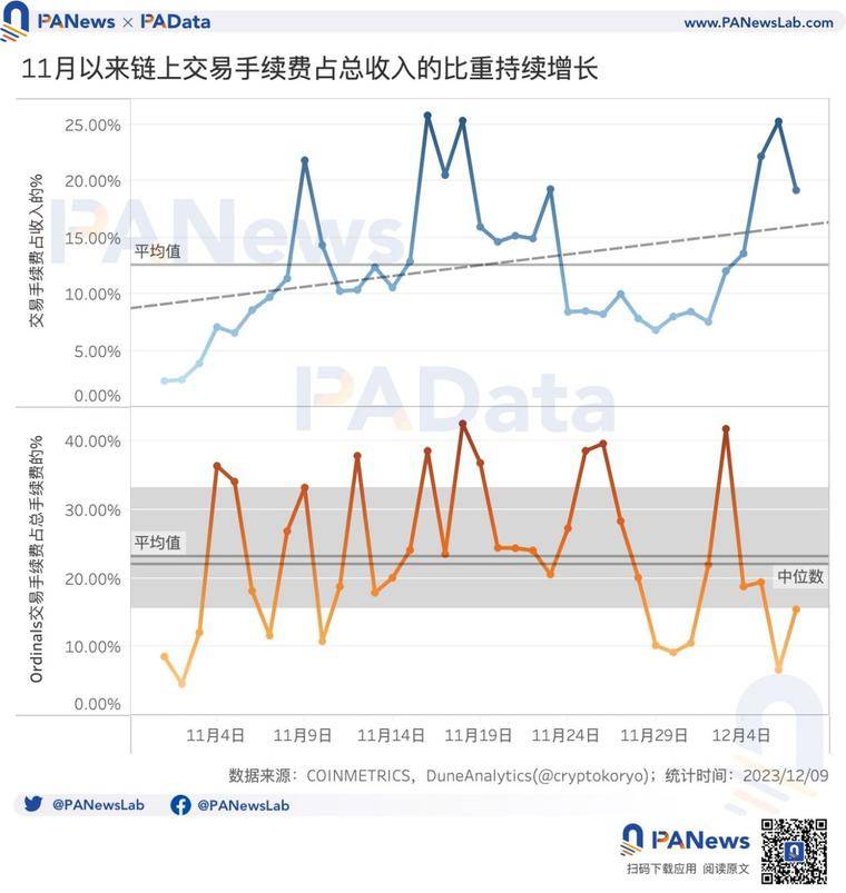 从每日交易手续费占总收入的比重(币本位比重)来看,11月以来保持了整体上升趋势。日均交易手续费占比12.49%,最高单日交易手续费占比25.80%。但是,Ordinals并没有贡献绝大多数的交易手续费。根据统计,11月以来,Ordinals交易手续费平均占比(币本位比重)23.20%,最高单日占比42.55%。
