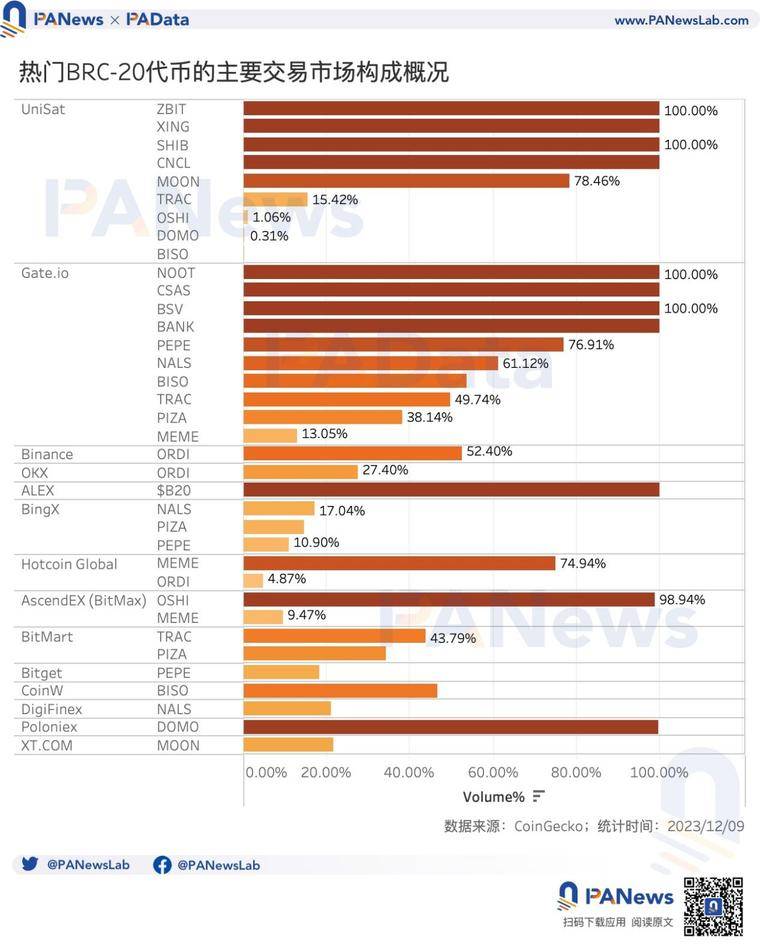换言之,大部分BRC-20代币的交易都高度依赖某一个单一市场。20种热门代币中有18种代币50%以上的交易额都来自同一个交易所。
