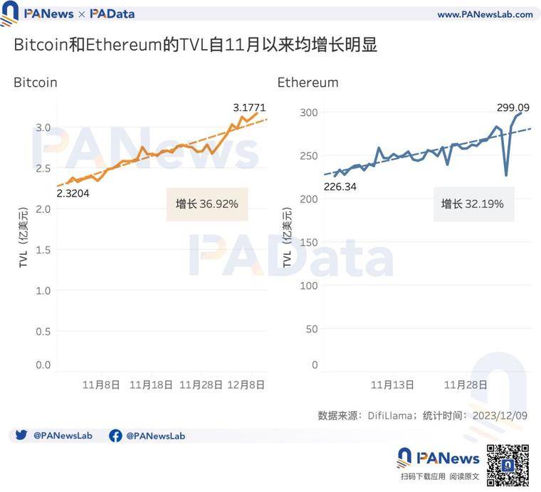 数据统计显示,12月9日,比特币上DeFi的TVL为3.18亿美元,较11月初增长了36.92%,涨幅明显。但同期,以太坊上DeFi的TVL也表现为增长趋势,TVL为299.09亿美元。目前尚未有明确的数据支持两者生态此消彼长的观点。未来另一种可能的局面是,比特币生态的发展可能带动去中心化应用的全面发展,促进不同链之间的联系。