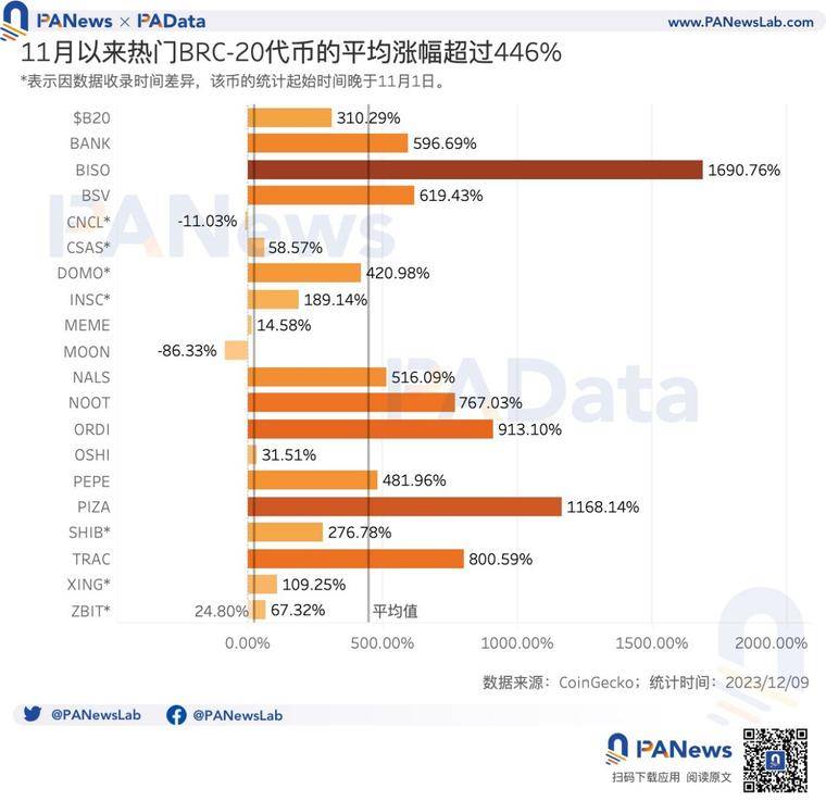 - 11月以来,热门代币的币价的平均涨幅达到了446.74%。其中,涨幅最高的是BISO,上涨了1690.76%,其次是PIZA和ORDI,分别上涨了1168.14%和913.10%。