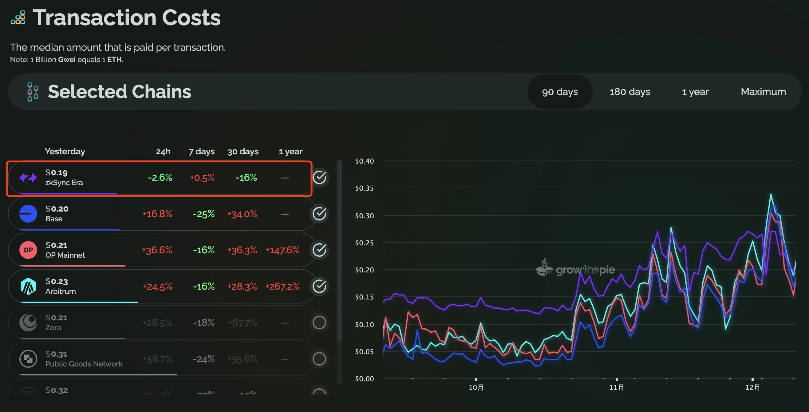 5)最近,zkSync 低调完成了 boojum 升级,同时集成了 STARK 和 SNARK 证明。(和我最早分析的判断一致),直接结果是,近 30 天,zkSync 的 Gas 费显著降低了 30% 左右,已经和 Arbitrum 达到了同一水平线。zkSync 原本就在用户体验上有优势,最近 Gas 费的下降会让其进一步获得更广的用户和流量。