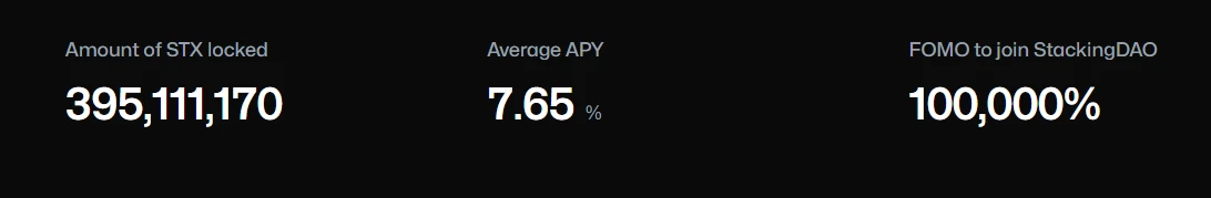 截至撰写本文时,已有将近 4 亿枚$STX 被质押在 StackingDAO,平均年化达到 7.65% 。