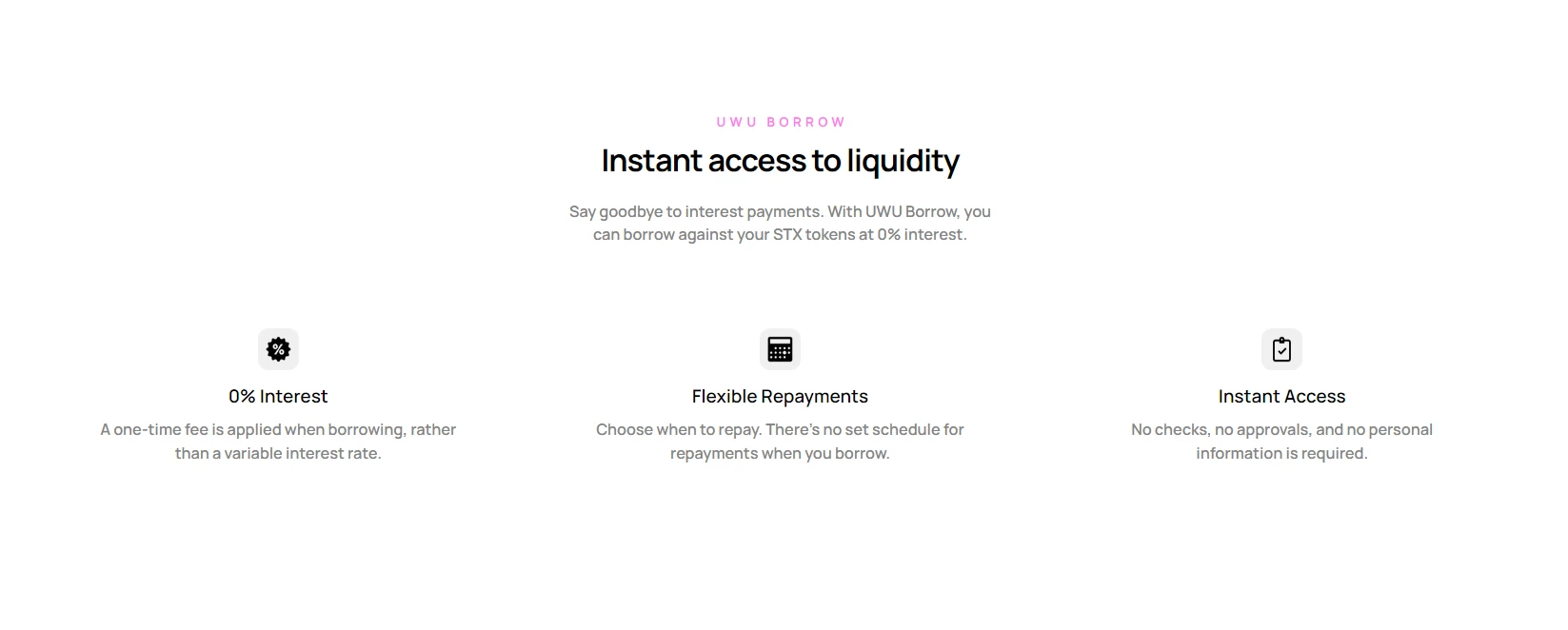 借贷机制:用户可以存入 STX 作为抵押品,借出最高达其存入 STX 价值 66% 的 UWU Cash,目前不需要缴纳利息,也没有固定的还款日。