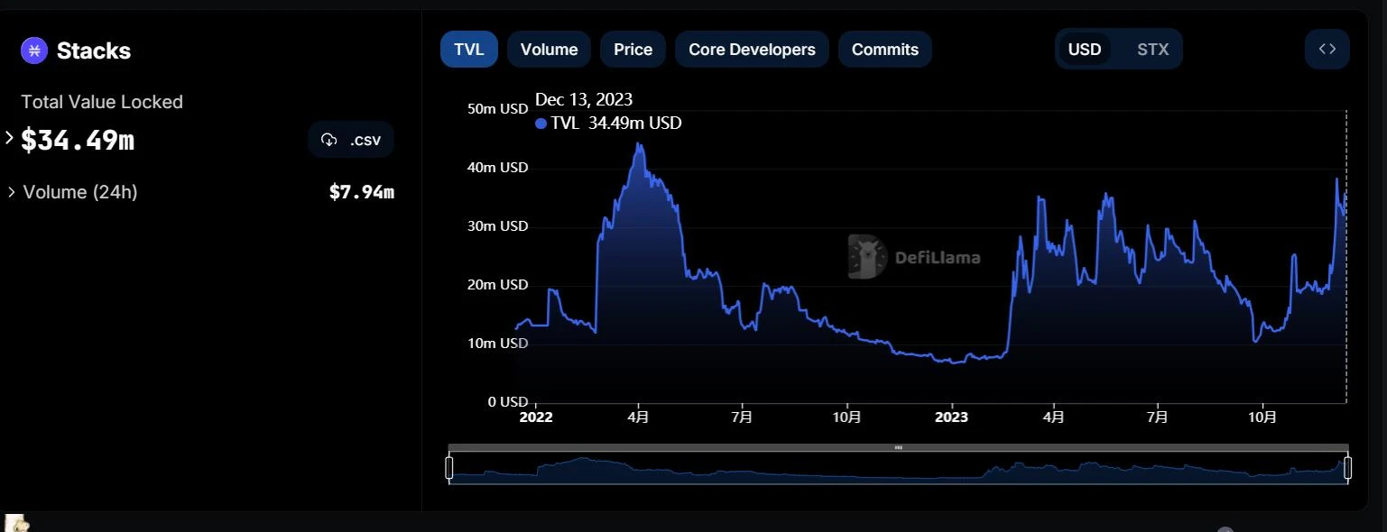 根据 DefiLlama 的数据,目前 Stacks 的 TVL 为$ 34.49 M,相对于以太坊L2,还有较大的上涨空间。