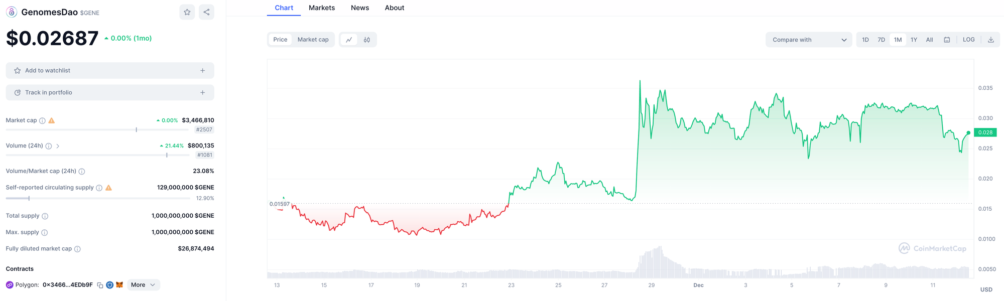 代币应用:使用 GENE 代币支付全基因组测序服务,并作为使用他们的加密 DNA 数据保险库进行查询的激励机制。