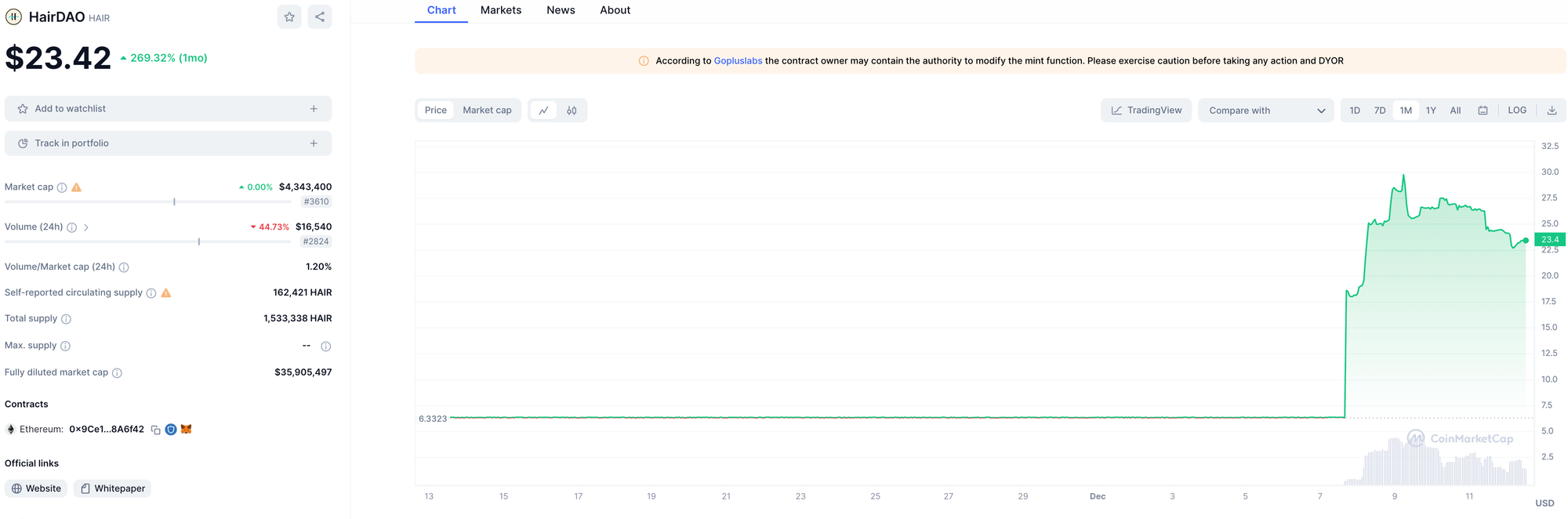 Meme 气质:在 DeSci 领域中,HairDAO 以其“脱发”主题和轻松幽默的形象脱颖而出,其推特上甚至使用了发廊的 emoji 符号,增强了其作为 meme 币的特性。
