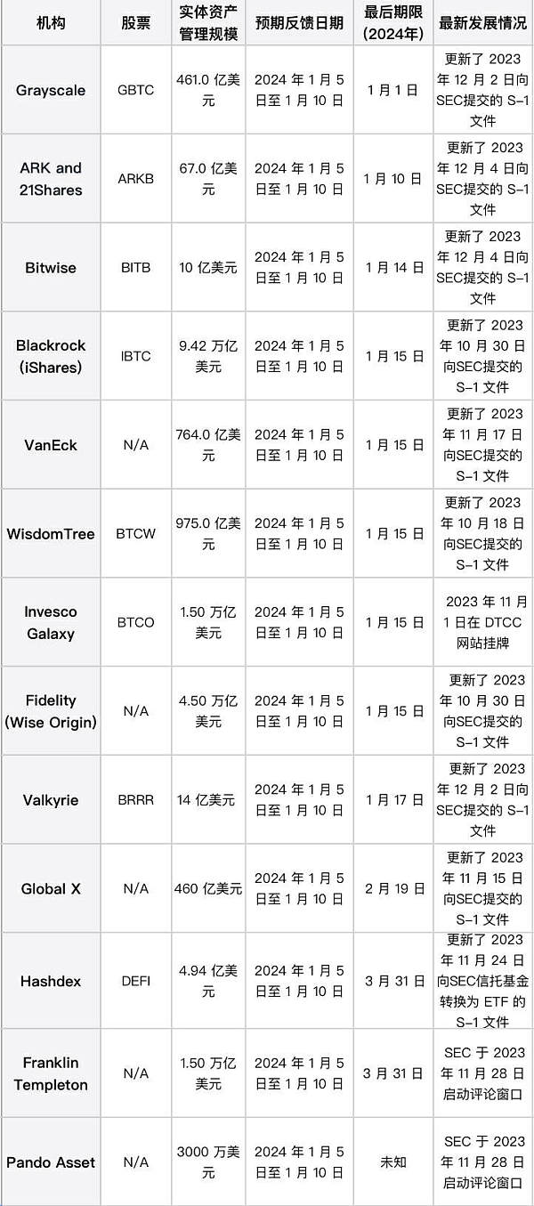 截止日期为2024年1月初至1月末的BTC ETF申请数量众多,其中包括贝莱德、富达和Invesco等行业巨头的申请。SEC的决定不仅对这些申请产生影响,还将为未来与Crypto资产相关的金融产品开创先例,被视为BTC更广泛应用的一步,也是主流金融市场的重大举措。