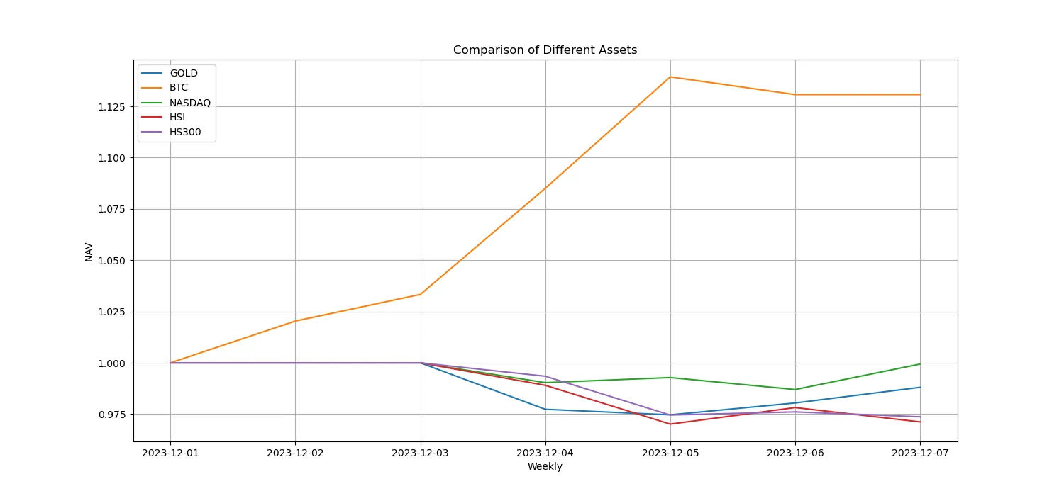 过去一周比特币/黄金/纳指/恒指/沪深 300 中,比特币最强势并瑶瑶领先,而表现最差的为恒指。