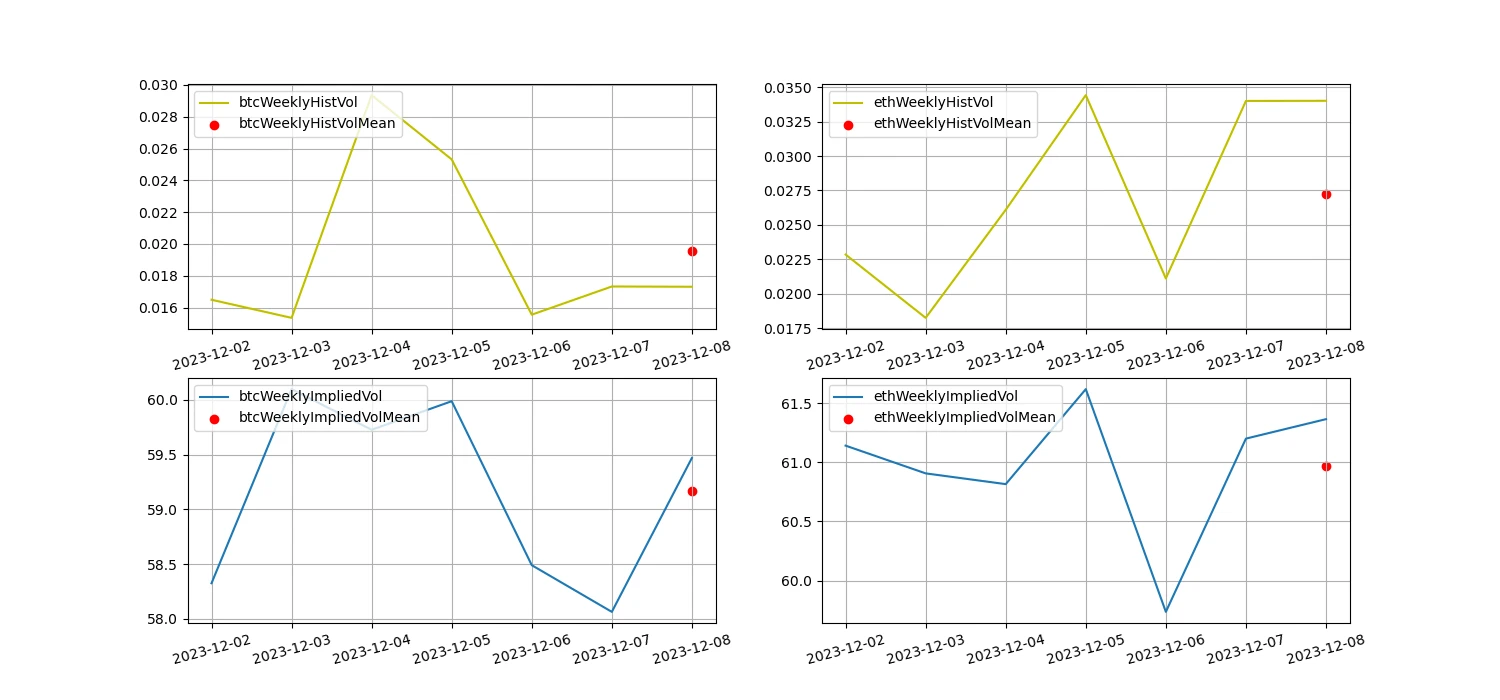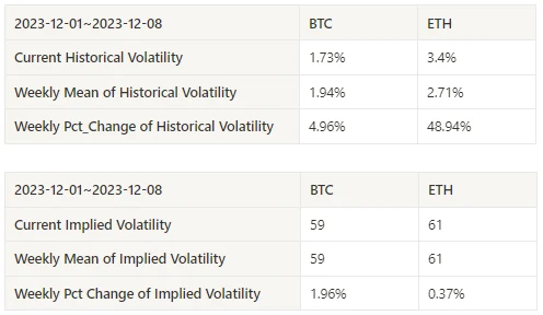 过去一周 BTC 与 ETH 历史波动率在 12.04 最高,隐含波动率都上升。