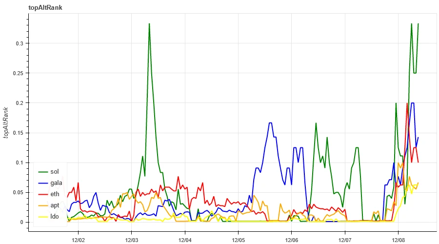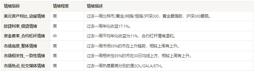 过去一周热度最高分别的是 SOL/GALA/ETH,情绪的上升同时价格也在创新高。