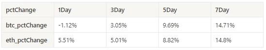 过去一周 BTC 价格上涨 14.71% ,ETH 价格上涨 14.8% 。