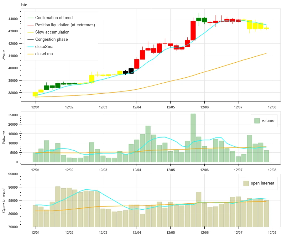 上图最上方 BTC 的价格走势,中间是成交量、最下方是未平仓量、浅蓝色是 1 天均值,橘色是 7 天均值。其中 K 线的颜色代表当前的状态,绿色是价格上升有成交量支持,红色是在平仓,黄色是在缓慢累积仓位,黑色是拥挤状态。
