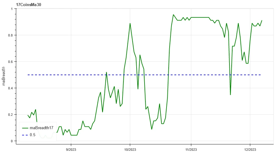 上图为['btc', 'eth', 'bnb', 'ltc', 'bch', 'doge', 'matic', 'sol','link','uni', 'enj','gala', 'mana', 'axs', 'dydx', 'fet' ,'gmx', 'xlm', 'xrp', 'ada', 'trx', 'sol', 'dot', 'avax', 'shib', 'atom', 'xmr', 'etc', 'ldo', 'hbar', 'apt', 'vet', 'qnt', 'vet','crv', 'aave', 'algo', 'ftm', 'ape', 'neo', 'sand', 'eos', 'xtz', 'rndr', 'theta', 'mkr']在 30 日均线上方的占比